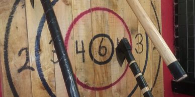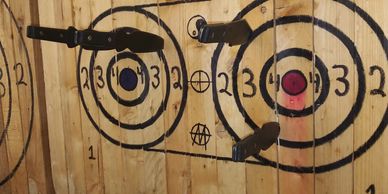 number is closed off until it’s your turn again. If you call a number and miss and want to aim again at the same number then you do not have to call it again until you switch to another number. In this game there is no tie. To win you must go at least 5 points higher than the current leader. The higher the score gets the more it forces you aim at smaller targets to get a higher score. EXAMPLE: Joe threw 6 knives and got 50 points. Now the only thing that matters is to get 55 or more points to knock Joe off and become the new top dog. It was my turn and I just threw a score of 65 points so Joes score does not matter anymore. The only thing that matters now is to get a score of 70 or more to be the new top dog. This is also a gambling game. Those points turn to dollars in that case. It turns out Casey got the high score of 75 points tonight so everyone in the tournament owes Casey $75. Since its timed you want to have enough targets available. No more than 4 to 5 people per targets. Each target should be exactly the same. Each =target should be exactly the same. There is nothing to write down score wise. Just focus on dethroning the top dog and topping their score. If you get really desperate you can aim at the colored dots also.