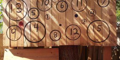 You will have a total of 18 knives to hit 11 targets. Starting with the #15. Continue to aim at the #15 until you hit it. Then move to the #14 and continue to aim for it until you hit it. Continue that down the scale till you hit the #5. If you have not hit the #9 within12 throws then you are out of the game. If you can get to the #9 within 12 throws (or hopefully beyond) you will get 6 more knives to get to the #5. If you miss your target number you may not touch the knife or move it in any way to facilitate making it easier for your next throw. If the missed knives are in the way, then that's too bad, you will have to throw around them. Yes, that does make the game harder so try not to miss. This is not an issue with archery and shooting but remember line shots do not count. Some part of the arrow or bullet hole must be within the circle.