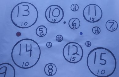 Start at the #15. Regardless of what happens you always aim at the next number down until you get to the black dot. 1 shot per number. 18 targets total. Add up your successful hits. 100 points or more, you win. Fast paced game.